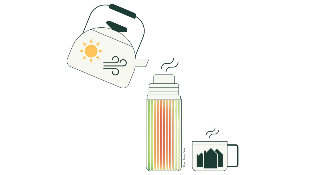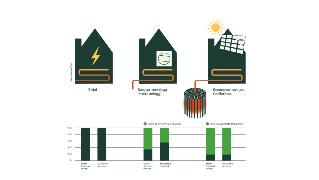 En geotermos er som en termos under bakken. Ved å plassere energibrønnene tett sammen dannes et stort bergvolum som kan varmes opp med overskuddsenergi. Når kulda kommer, kan varmen hentes opp igjen og brukes til oppvarming (figur 2).