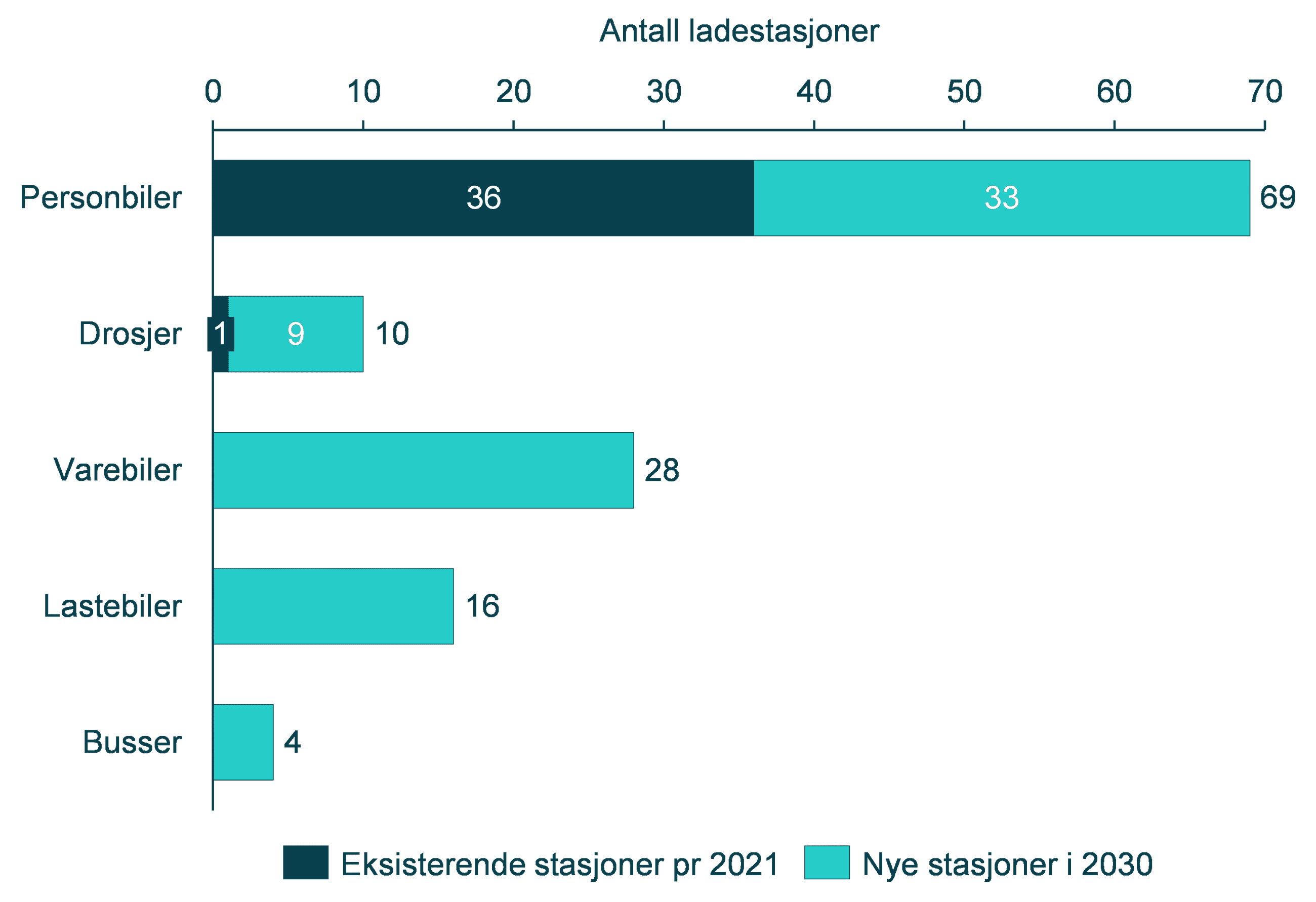 Med utgangspunkt i denne effektutviklingen i hurtigladerparken estimeres antall hurtigladepunkter det vil være behov for fremover. Det høyeste antall ladepunkter vil nødvendigvis tilegnes personbiler og varebiler grunnet den store kjøretøybestanden. Antall nødvendige hurtigladepunkter for hvert segment i 2030 er presentert i Figur 1
