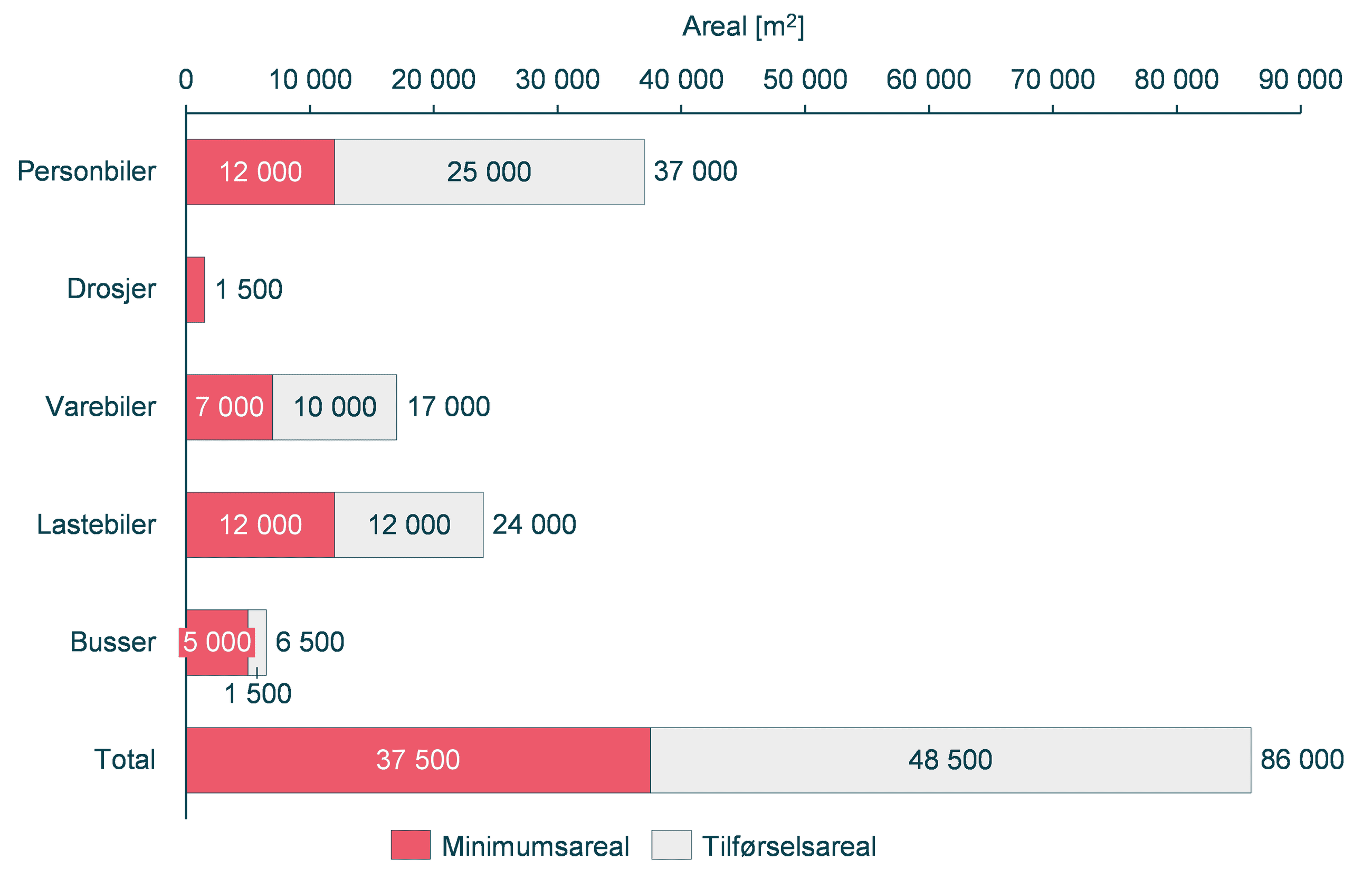 Stasjonsantallet vil til stor grad påvirke nødvendig areal til hurtiglading. Med stasjonsfordelingen beskrevet ovenfor anslås det at hurtigladeinfrastrukturen i Oslo vil beslaglegge et samlet areal på 86 000 m2. Personbiler, lastebiler og varebiler står alle for betydelige arealbehov, mens behovene til busser og drosjer vil være begrensede. Estimert fremtidig arealbehov per segment er oppsummert i Figur 3 nedenfor: