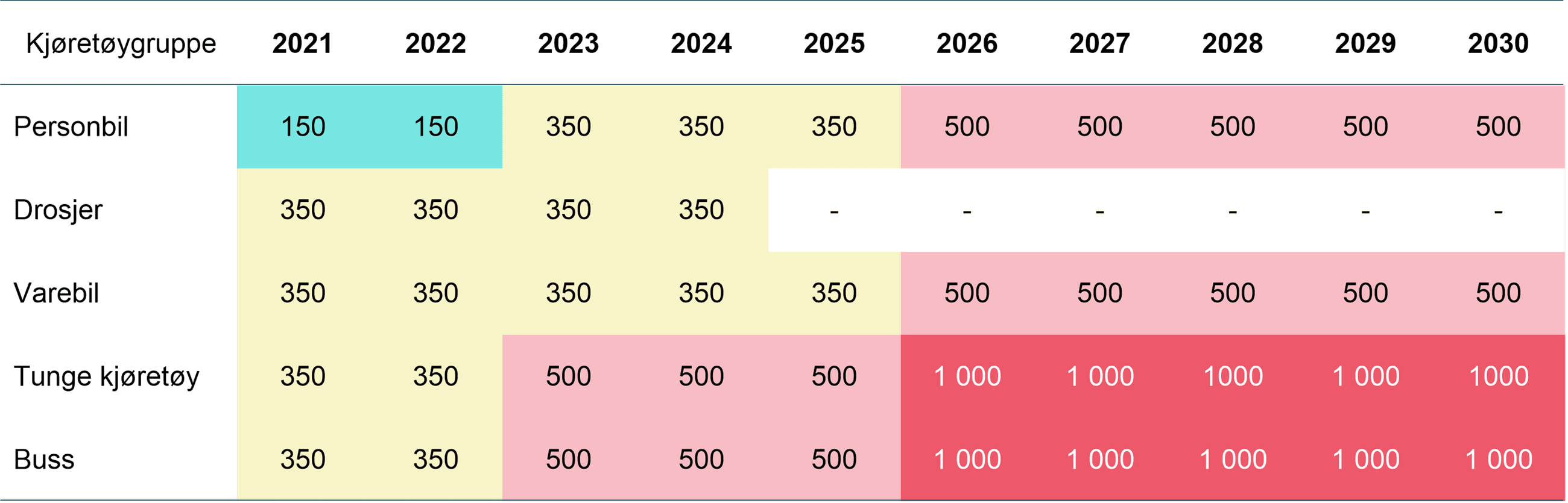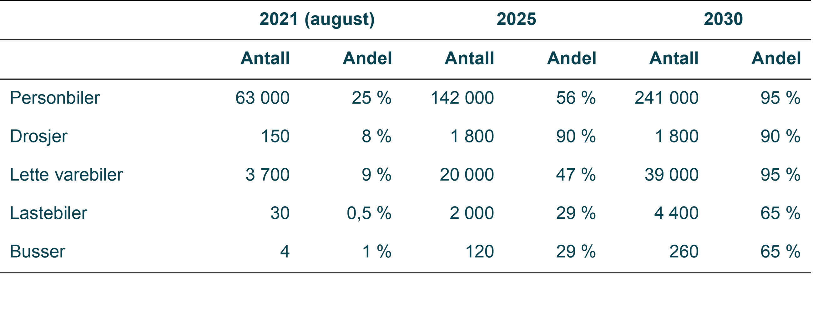 Tabell 1: Utvikling av elektriske kjøretøy fra dagens nivå (august 2021) til 2025 og 2030.