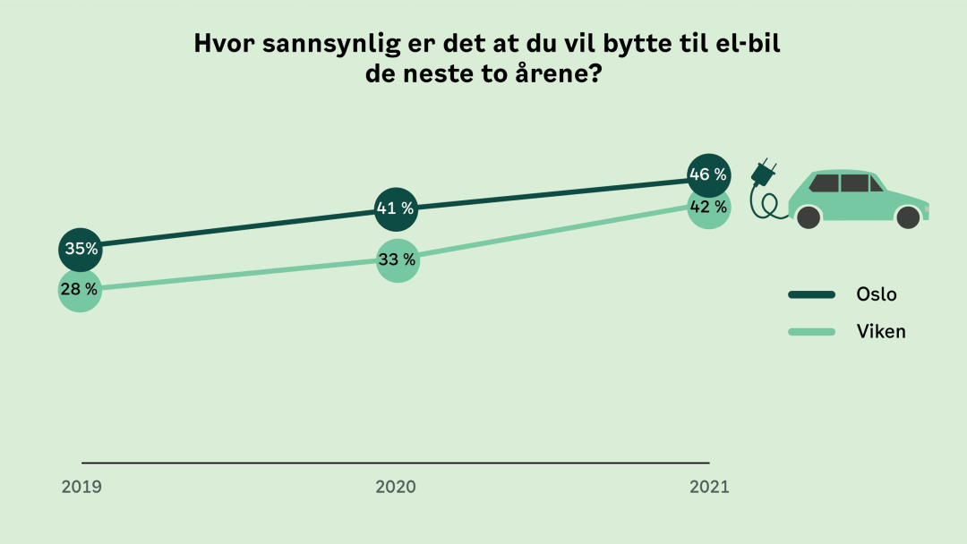 Flere har allerede skaffet seg eller planlegger å bytte til elbil gjennom perioden fra 2019 til 2021 i både Oslo og gamle Akershus. Sistnevnte scorer gjennomgående høyere enn Oslo, men differansen er på sitt laveste i 2021, med henholdsvis 46 og 42 prosent oppslutning.