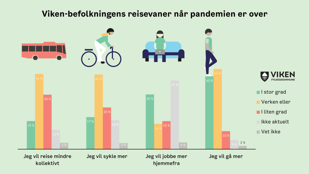 Hvordan vi reiser har også endret seg. 65 prosent sier at de har reist mindre kollektivt. Samtidig har folk gått mer og syklet mer. Over halvparten (53 prosent) sier at de gått mer, og 9 prosent sier de har gått mindre. Det er omtrent like mange som sier at de har kjørt mer (27 prosent) som at de har kjørt mindre (25 prosent). Det er de individuelle reisemåtene som har vunnet terreng, og kanskje spesielt de aktive reisemåtene sykkel og gange. Her følger en oversikt over hvilke endringer folk tror vil bli varige for dem.