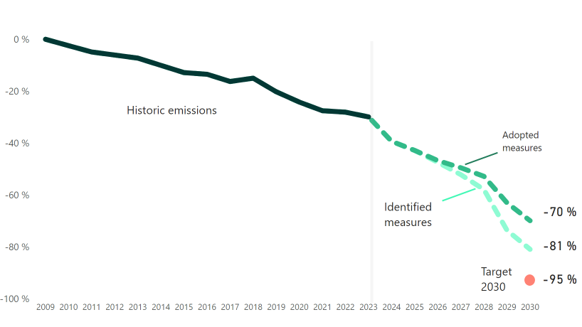 The Climate Budget 2026 shows that emissions can be reduced by 70 percent by 2030 compared with 2009 levels, based on adopted measures. Figure: Climate Agency.